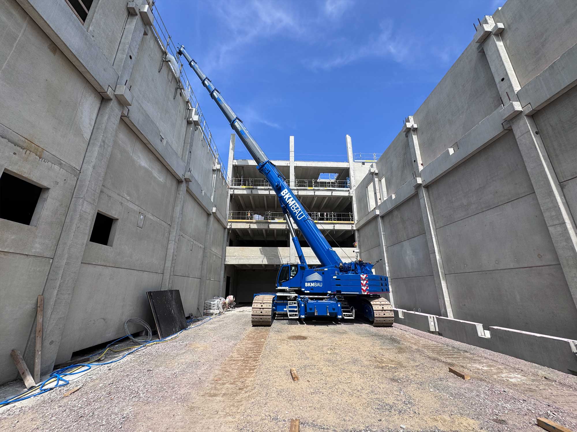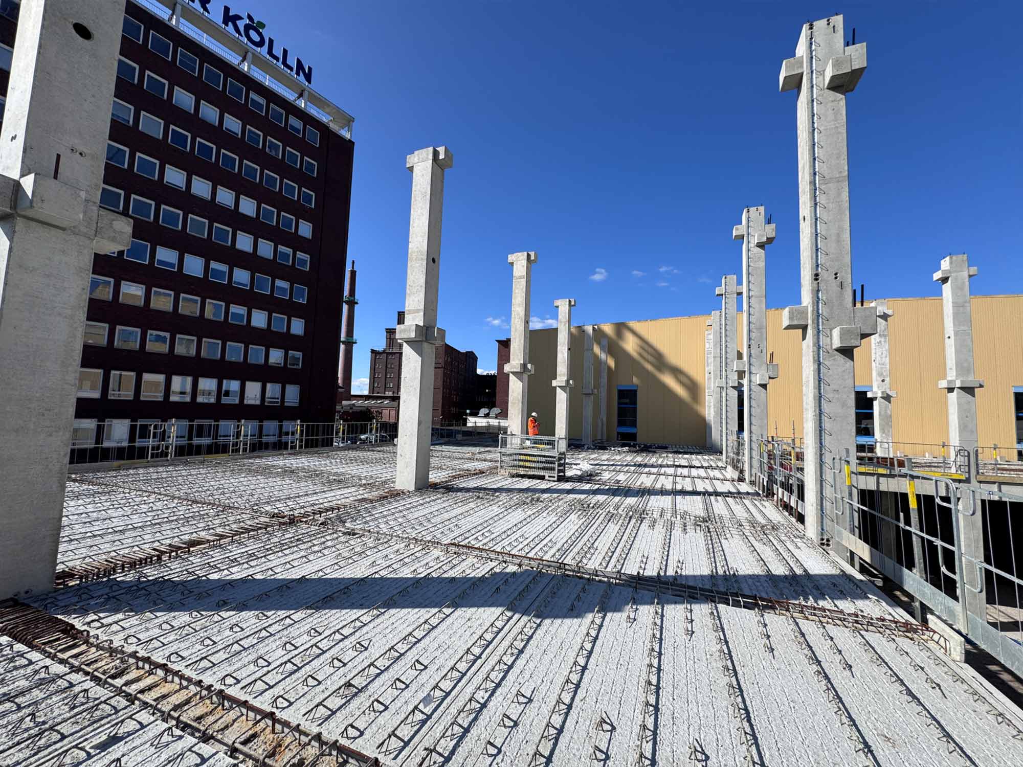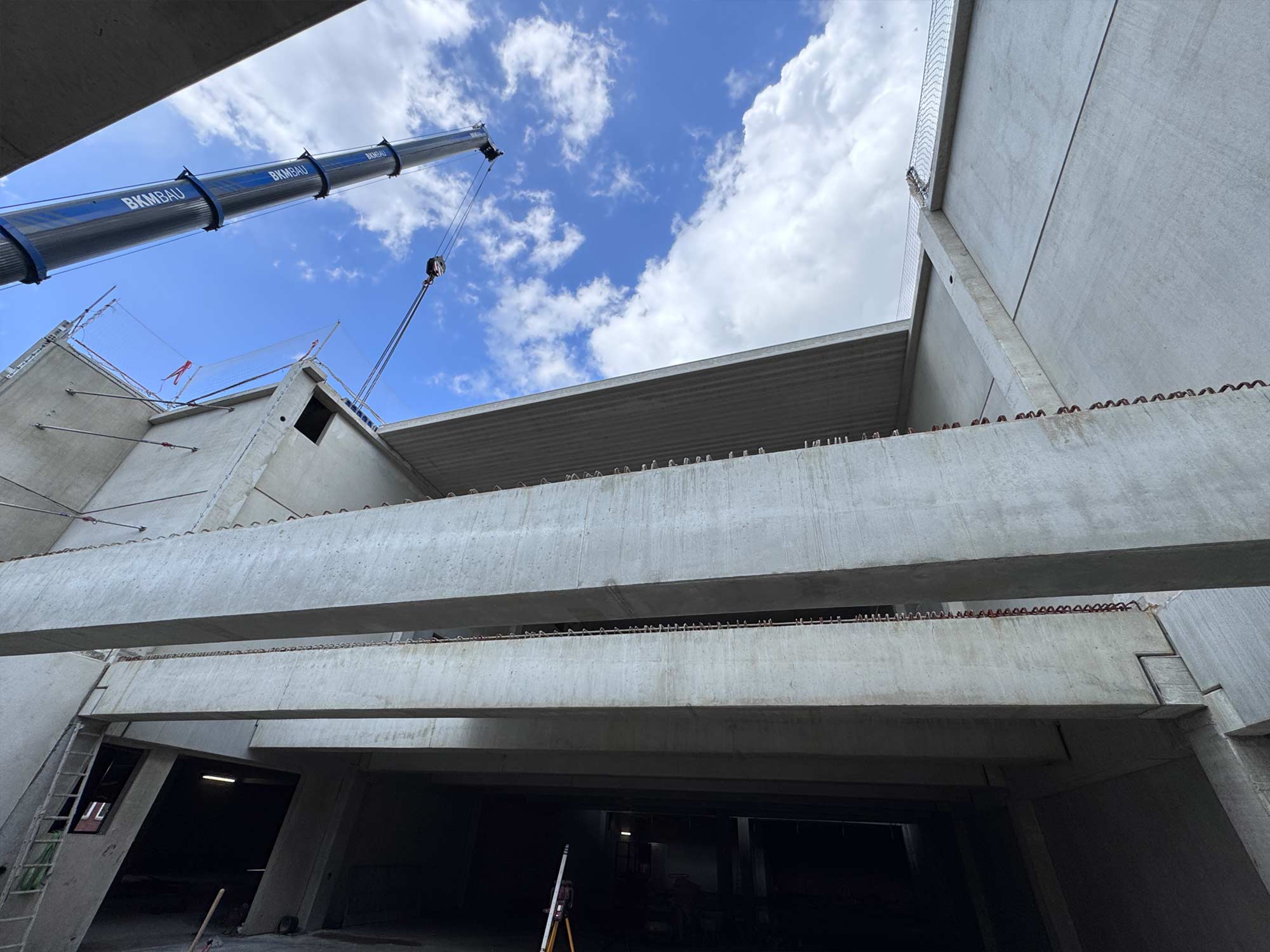Für die Konstruktion in Fertigteilbauweise haben wir rund 500 Elemente aus Stahlbeton und Spannbeton produziert und diese just-in-time zur Baustelle geliefert, wo sie von unseren Montageteams fachgerecht montiert wurden. Das Gesamttragwerk wird kombiniert mit Zwischendecken aus 120 Fertigdecken und 220 Spannbeton-Hohldecken.