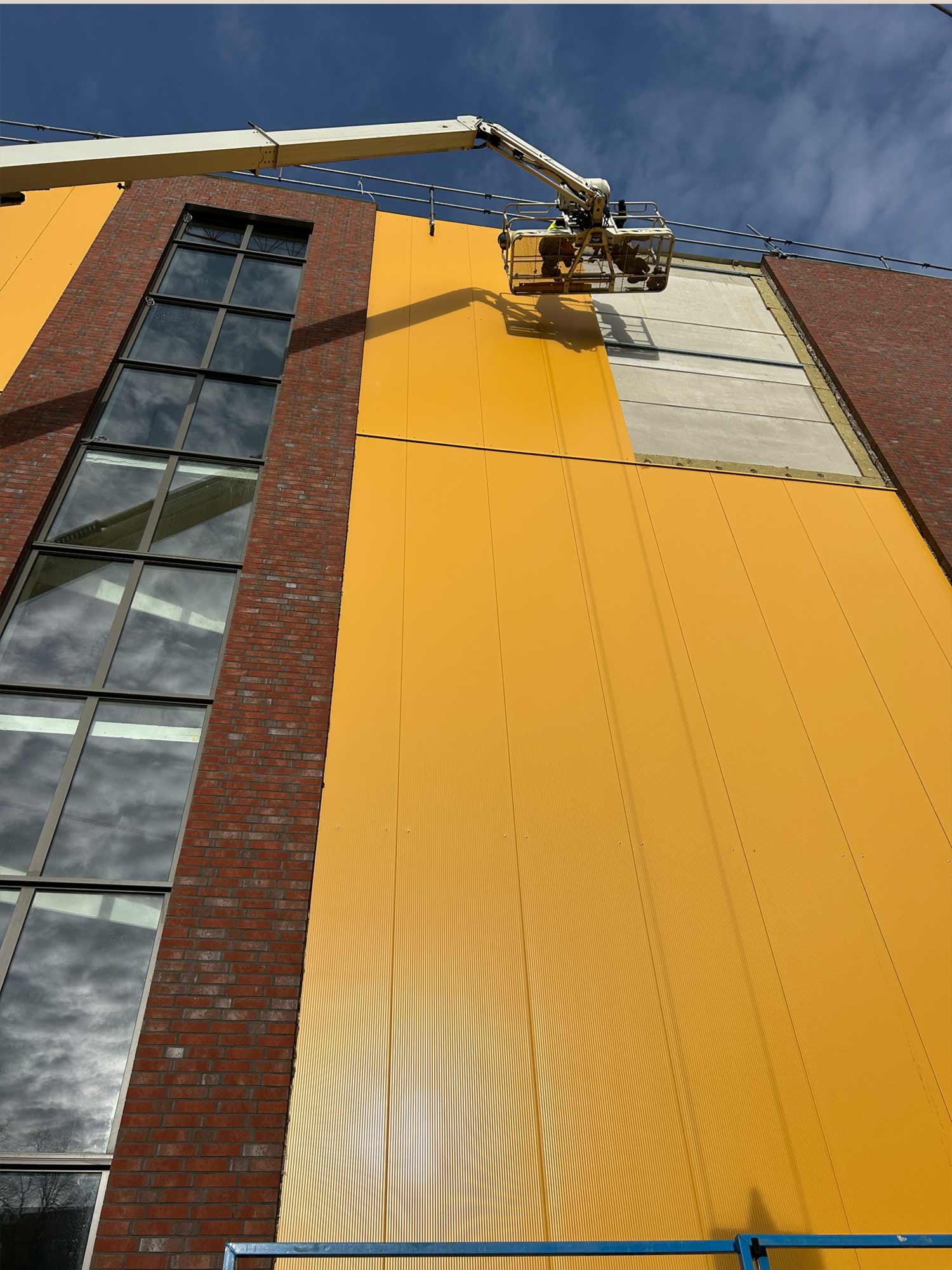 Das Hallengebäude wurde nach einem hohen energetischen Standard erreichtet und mit ISO-Außenwänden aus Polyurethan-Sandwichelementen verkleidet. An der straßenseitigen Hauptfassade, die aus Verblendsteinen, hafergelben Fassadenflächen und durchlaufenden Lichtbändern besteht, verbinden sich traditionelle und moderne Materialien zu einem harmonischen Gesamtbild. Durch das Zusammenspiel klassischer und zeitgemäßer Gestaltungselemente gewinnt die Westerstraße deutlich an architektonischer Qualität und Ausdruck.